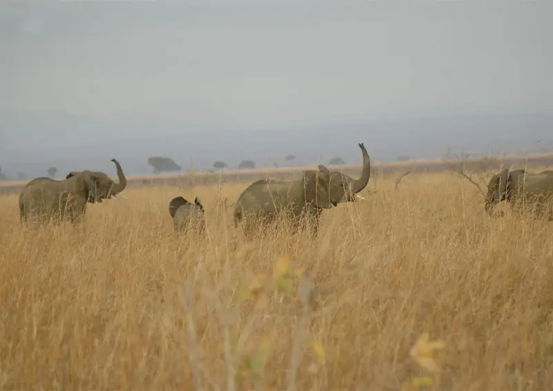 - Elephants, buffaloes, giraffes, zebras, and antelopes