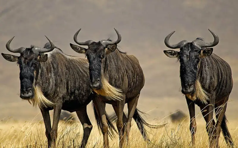 - Zebras: Often travel alongside the wildebeest.