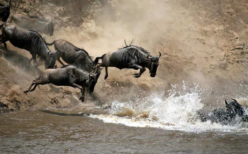 - Thousands of wildebeest and zebras attempt to cross crocodile-infested waters.